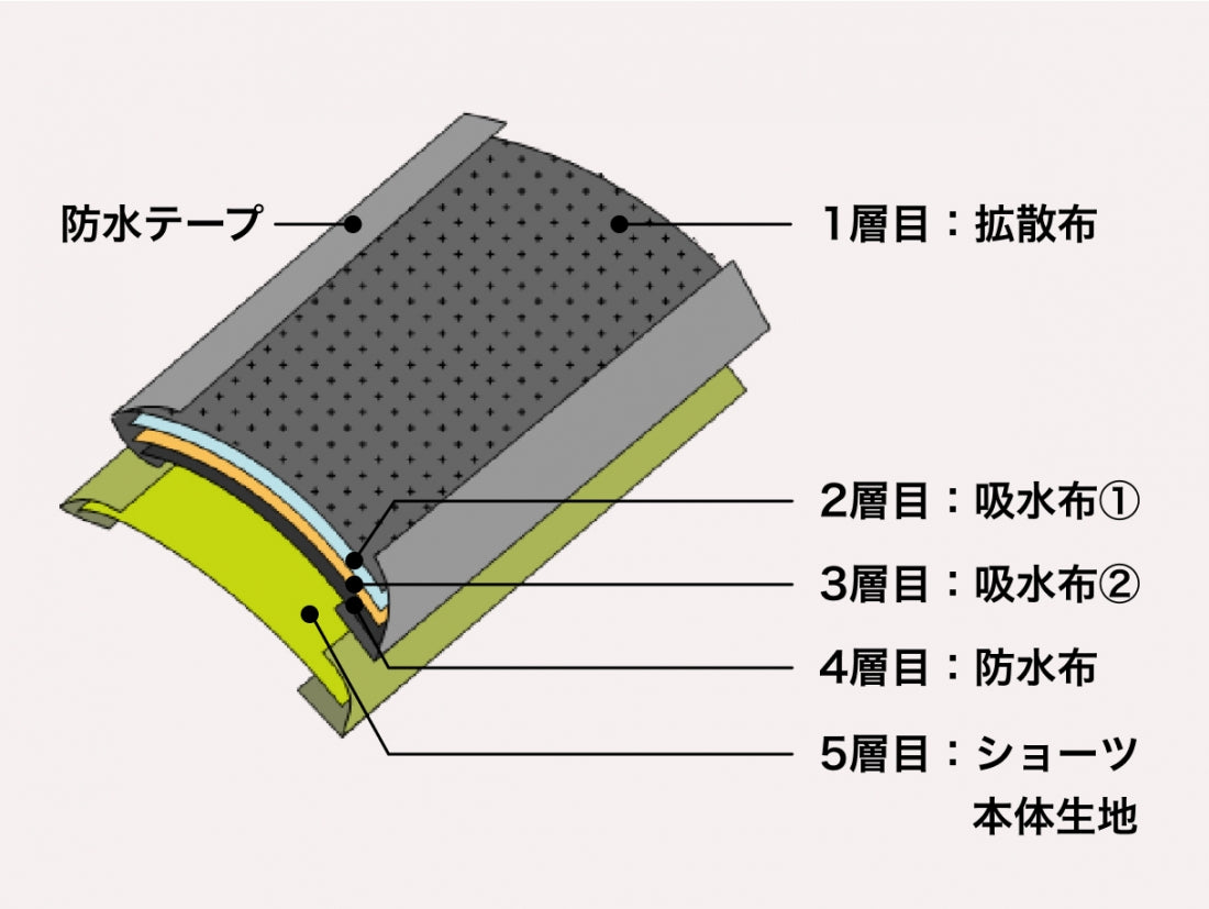 肌に触れる吸水帯クロッチ部分は、素早く液体を吸ってドライに保つ拡散布、液体をしっかり受け止める2枚の吸水布、液体の漏れを防ぐ防水布、ストレッチ性の高い本体生地の5層構造。15-20mlの水分を吸収して、ベタつき感やニオイも軽減します。