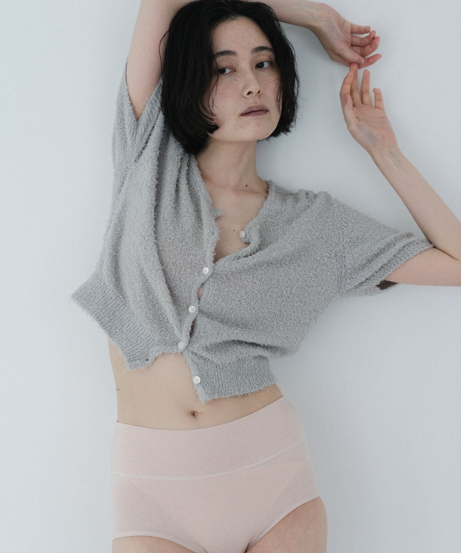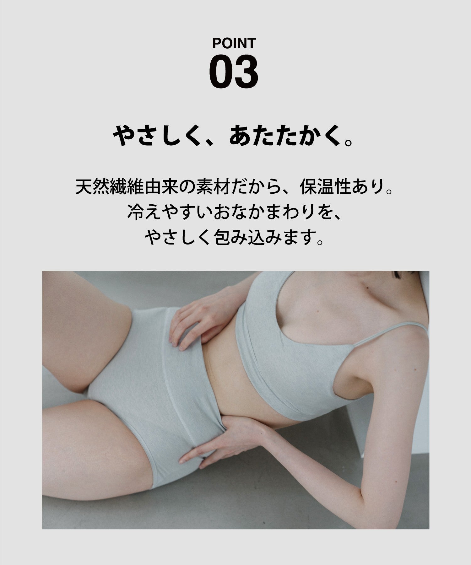 深めの股上でおなかをやさしく包み込み、ふんわりあたたかく守ります。