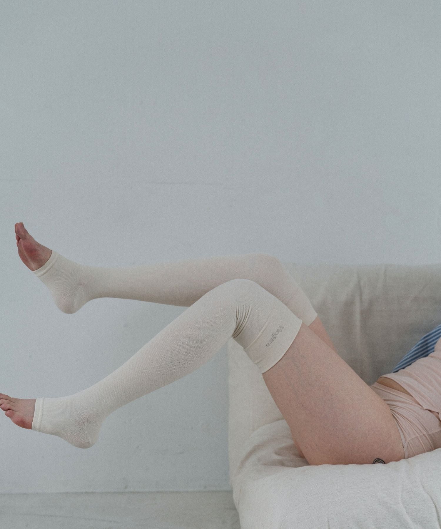 吸水ショーツ同様に安全性と機能性の高いRepur®加工を施し、抗菌・消臭・部屋干し臭をケアしたオーガニックコットン混素材の着圧ソックス。